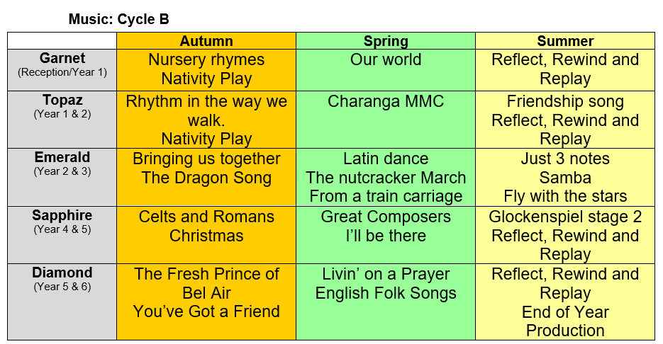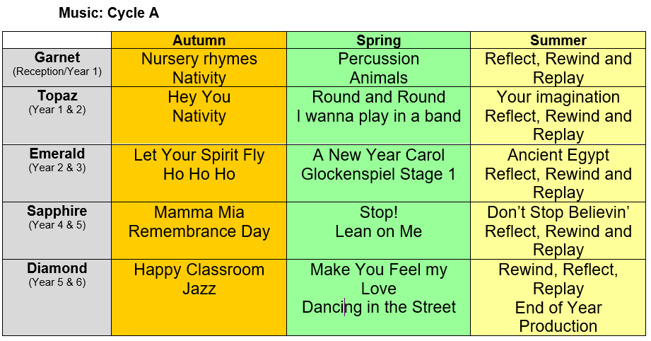 Music units are taught in a two year rolling cycle due to the mixed aged class structure.